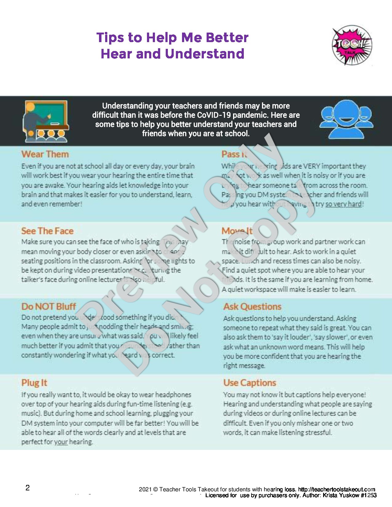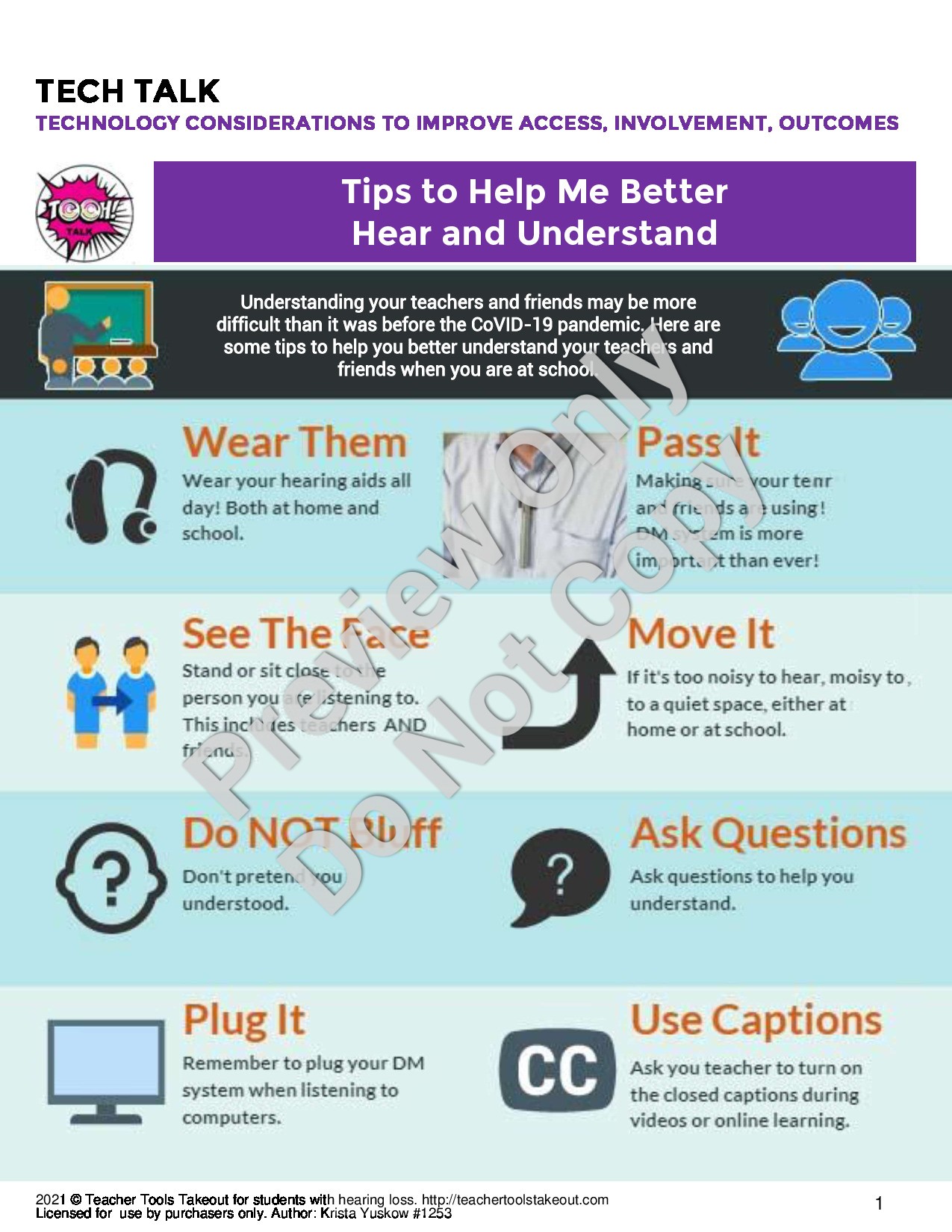 Shop Now| This 2 page handout provides concise tips to help students who are hard of hearing to fully access communication. |