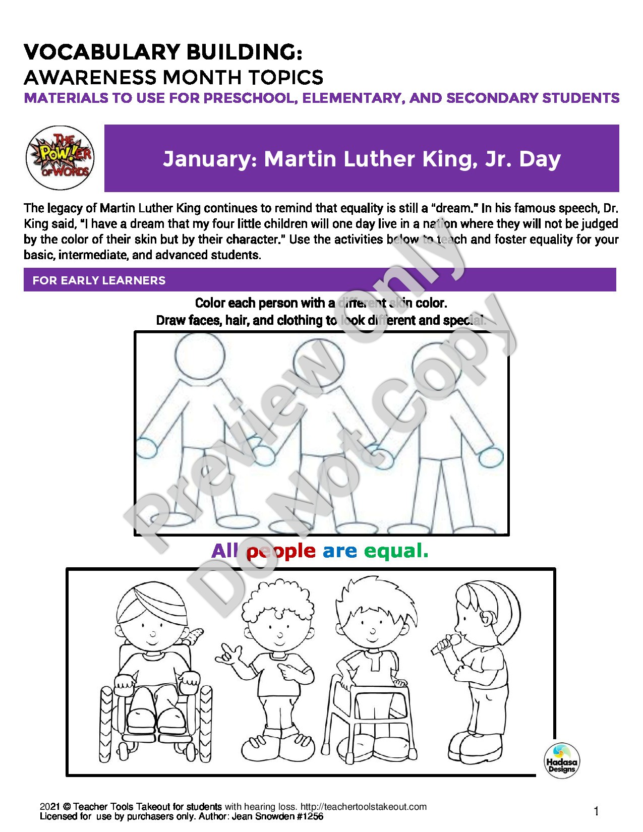 Shop Now| These worksheets and activities are a fun way to introduce new vocabulary, start a discussion, and extend a lesson on Martin Luther King Jr. Day. Includes language activities and fillable worksheets for word association, part to whole; fill in the blank, writing, reading comprehension, and critical thinking. |